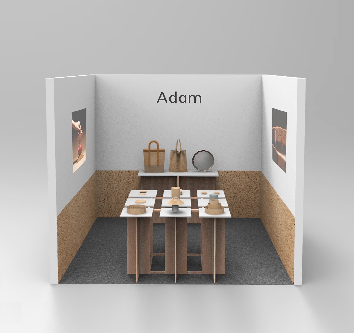 “廃棄”とされていたりんごの搾りかすが、空間に静かに息づくプロダクトへと生まれ変わる、その過程を直接ご覧いただける貴重な機会です。展示ブースは、Adam 素材の手触りや質感を直接感じていただけます。また展示台はりんご搾りかすを再利用した左官材料「Adam Wall Texture」により仕上げられております。