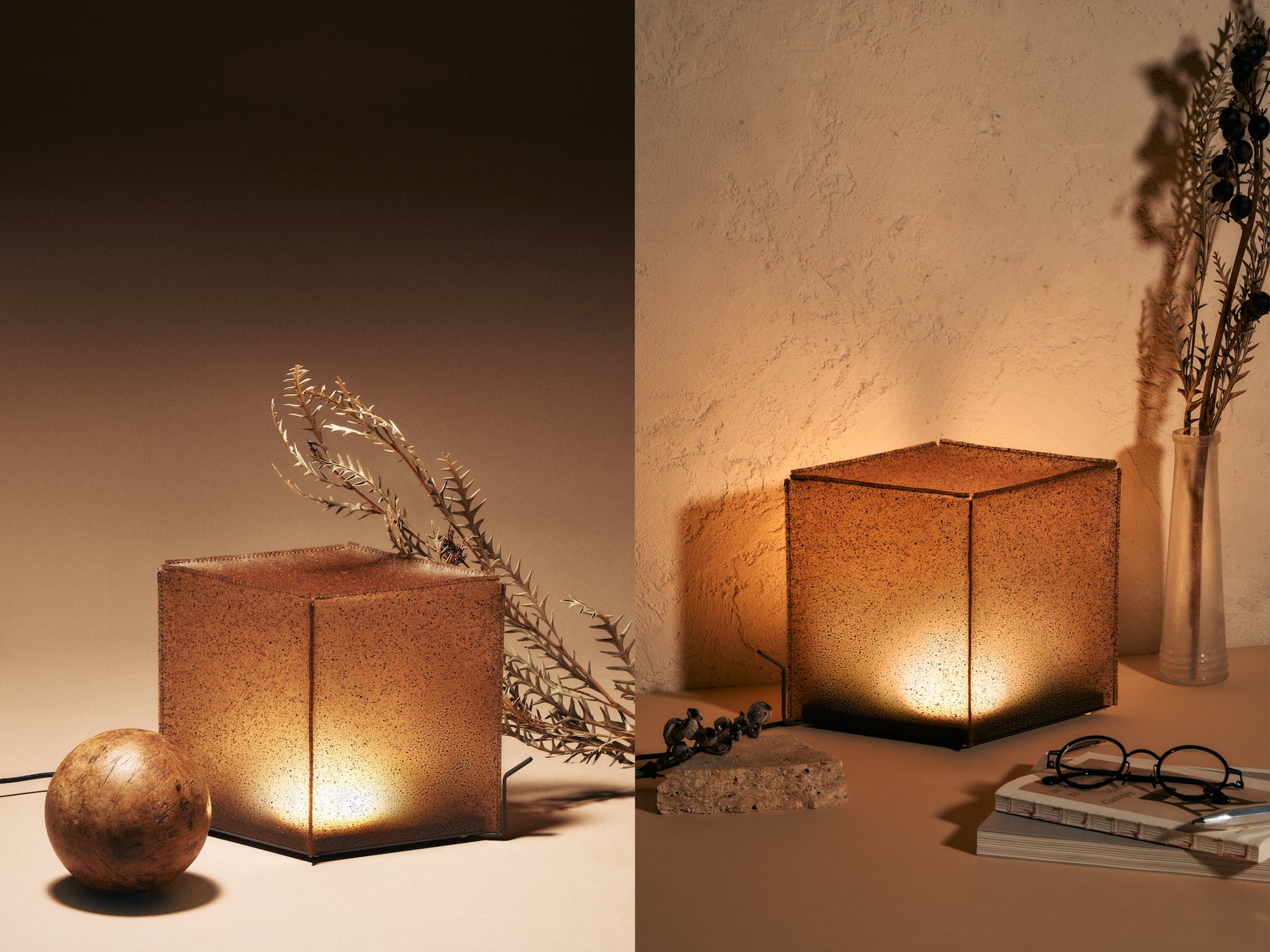 幾何学的なフォルムは、シートが自立するための構造から生み出され、りんごの種や皮を含んだ不均一な表情を持つAdamシートが自然で柔らかな光を拡散します。