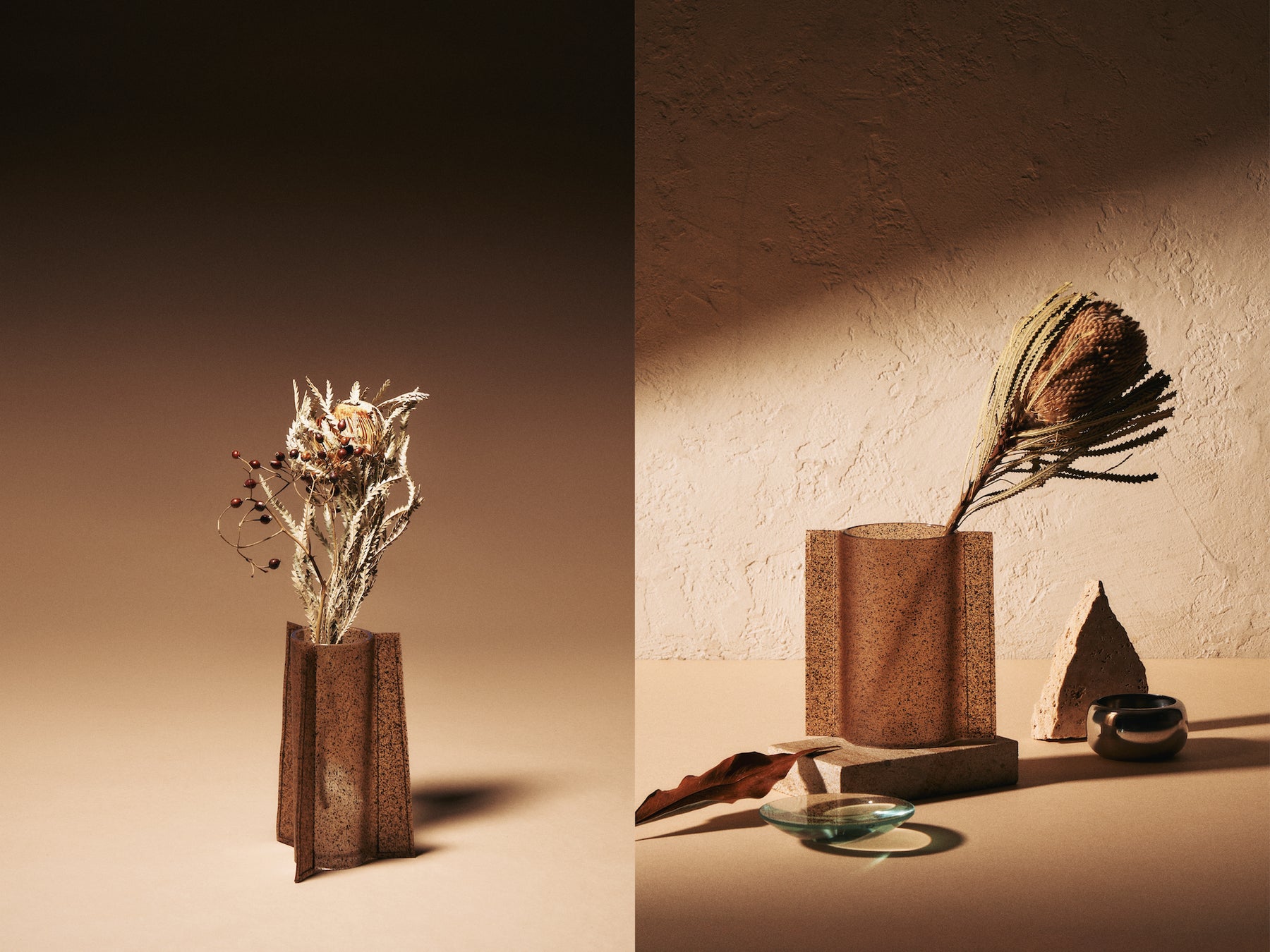 素材の素朴な風合いと建築的な佇まいが、さまざまなシーンに調和しながら独自の存在感をもちあわせています。